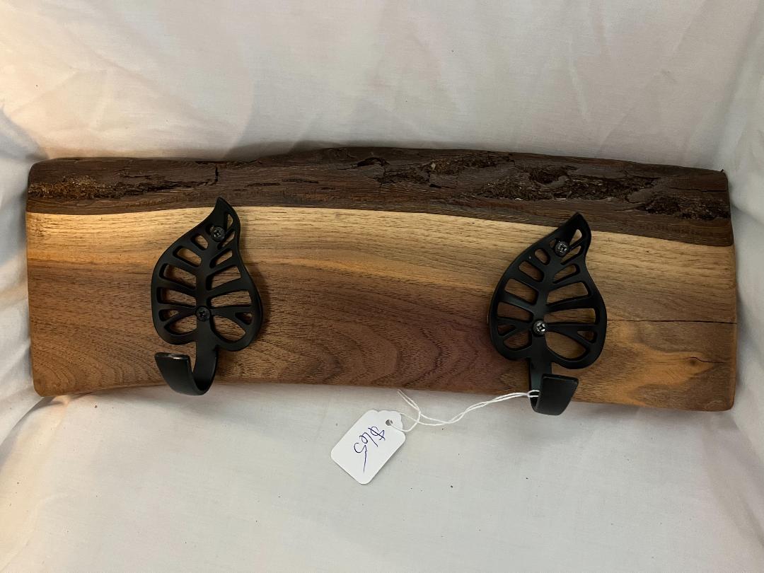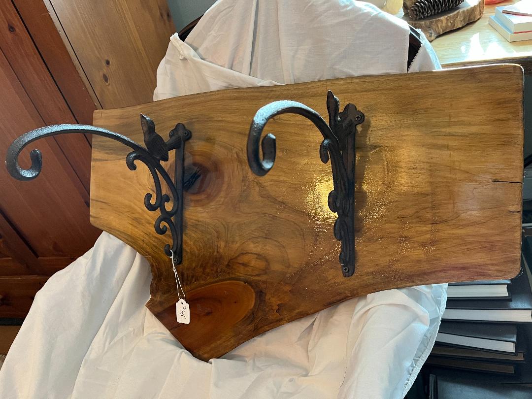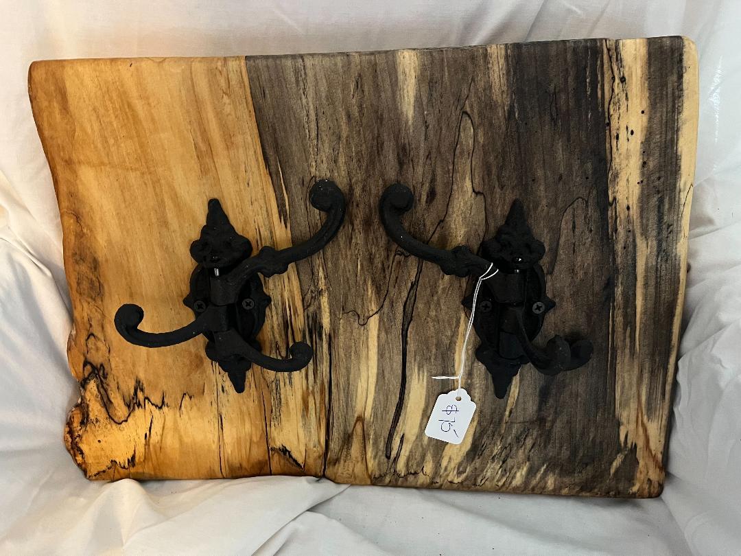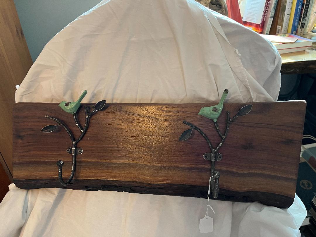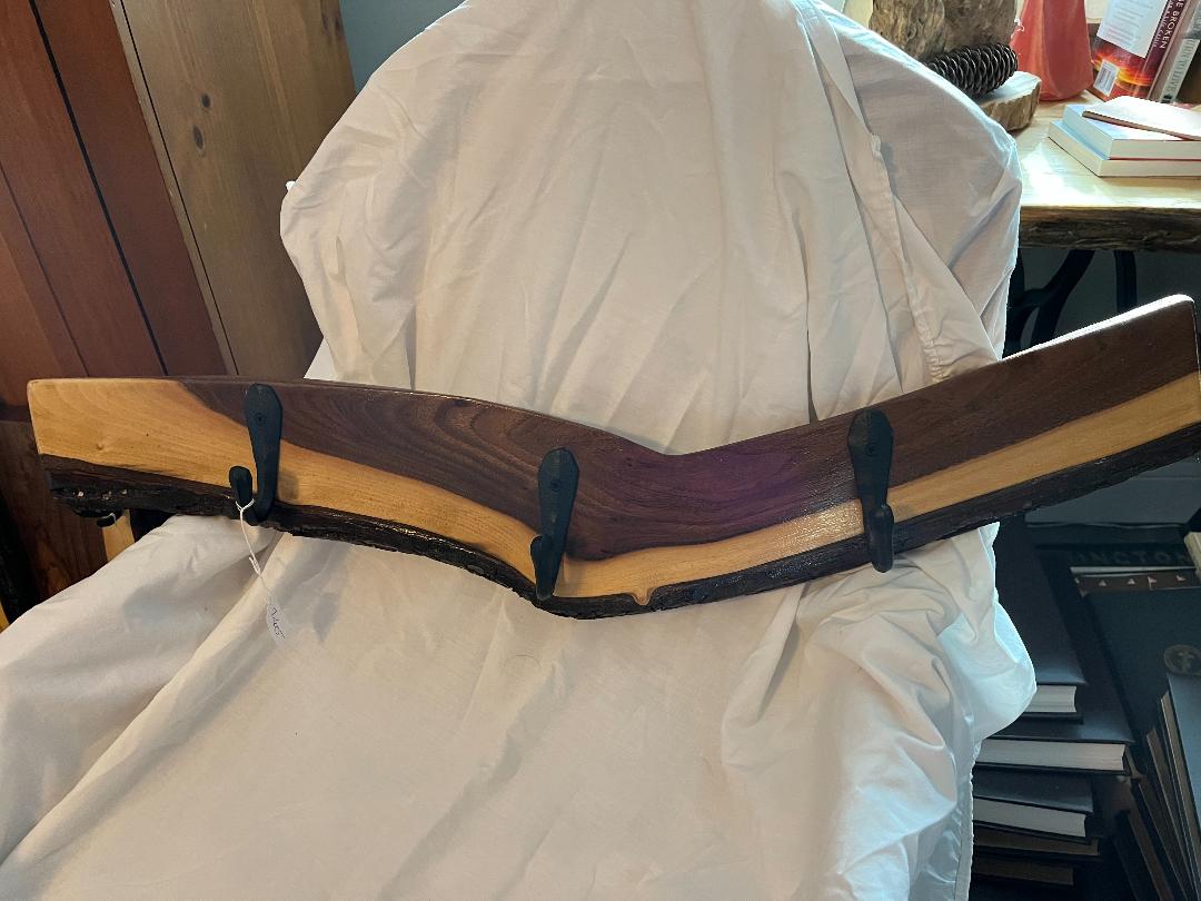 This is a fun piece with moveable hooks. Two pieces on the board. The color of this wood is amazing.