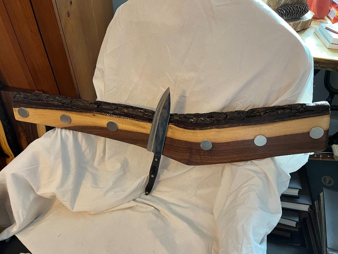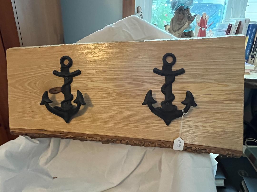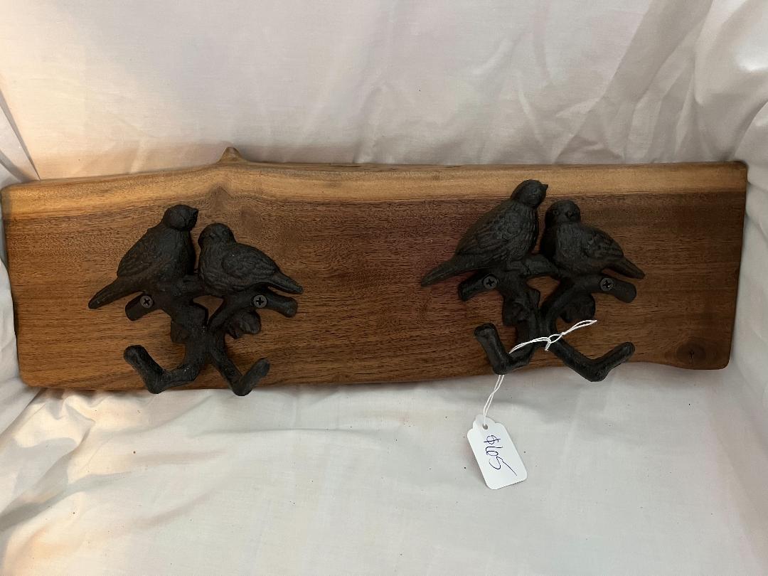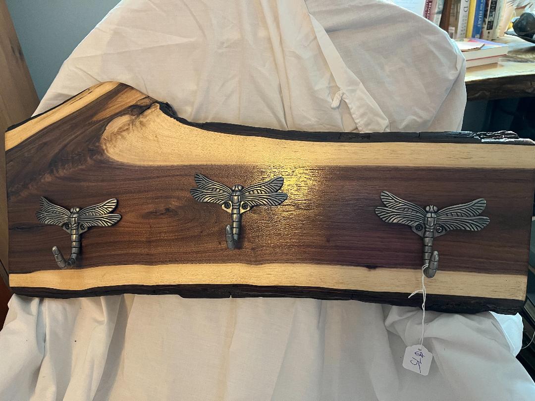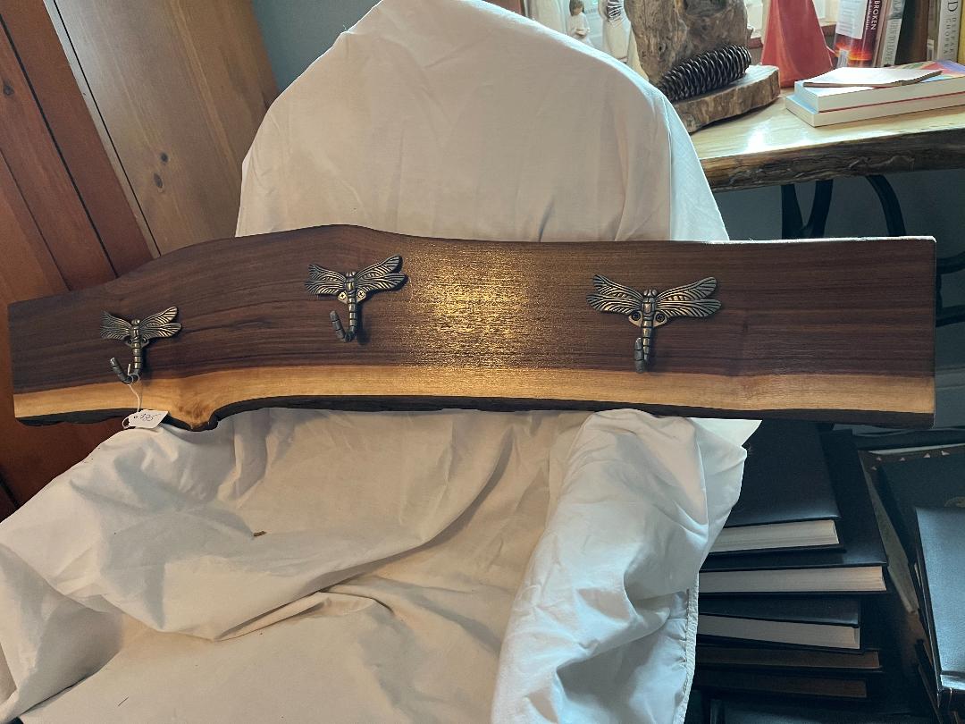 This is a fun piece with moveable hooks. Two pieces on the board. The color of this wood is amazing.