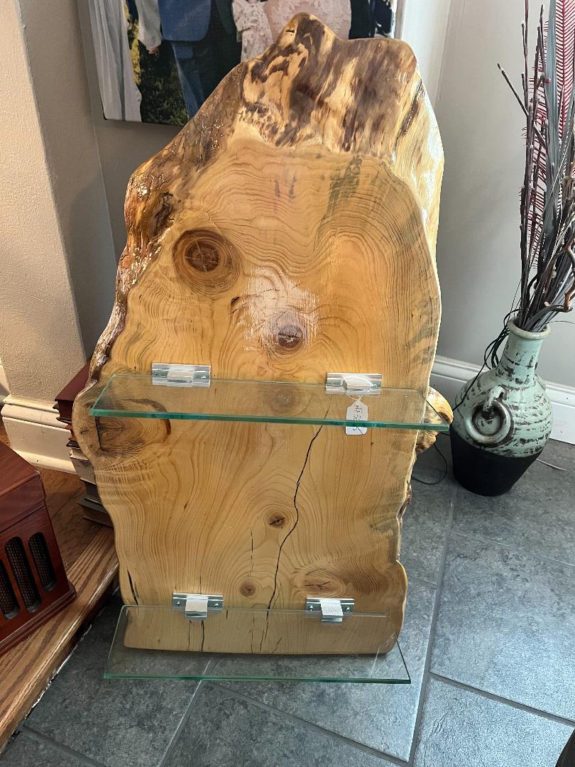 This is an amazing piece. A Custom Live Edge Finished Piece with Two Gladd Shelves to hang proudly above your bar!!